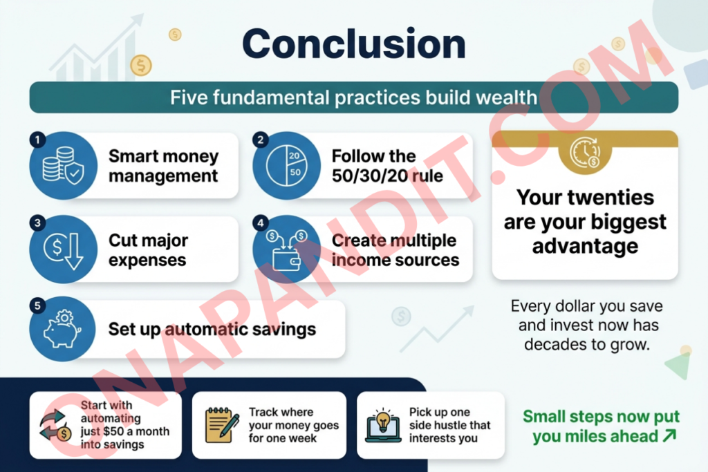 Your twenties are the perfect time to get this right because time is your biggest advantage. Every dollar you save and invest now has decades to grow. Start with automating just $50 a month into savings, track where your money goes for one week, or pick up one side hustle that interests you. Small steps now will put you miles ahead of your peers who are still wondering where their paycheck went.